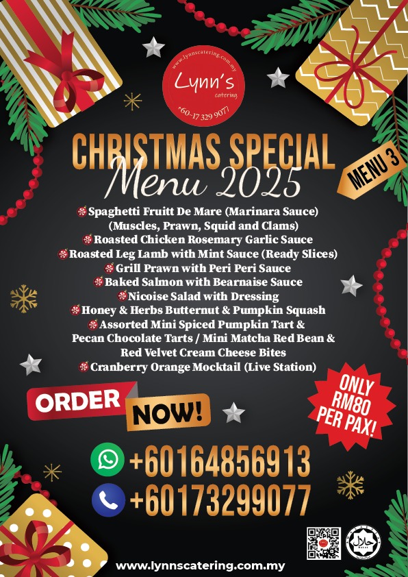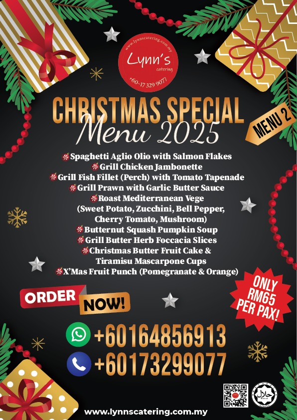 Roast Chicken with Creamy Peri Peri Sauce Turkey Ham Enchiladas Baked Tandori Salmon with Sweet, Spicy Tomato Chutney Garden Salad with Sesame Dressing Baked Cheesy Mix Pasta with Mushroom Sauce and Streaky Chicken Grill Chicken Patty and Sausages with Creamy Cajun Sauce Log Cake / Christmas Cake X’mas Punch Drink (7up+Ribena+Lemon Slice)