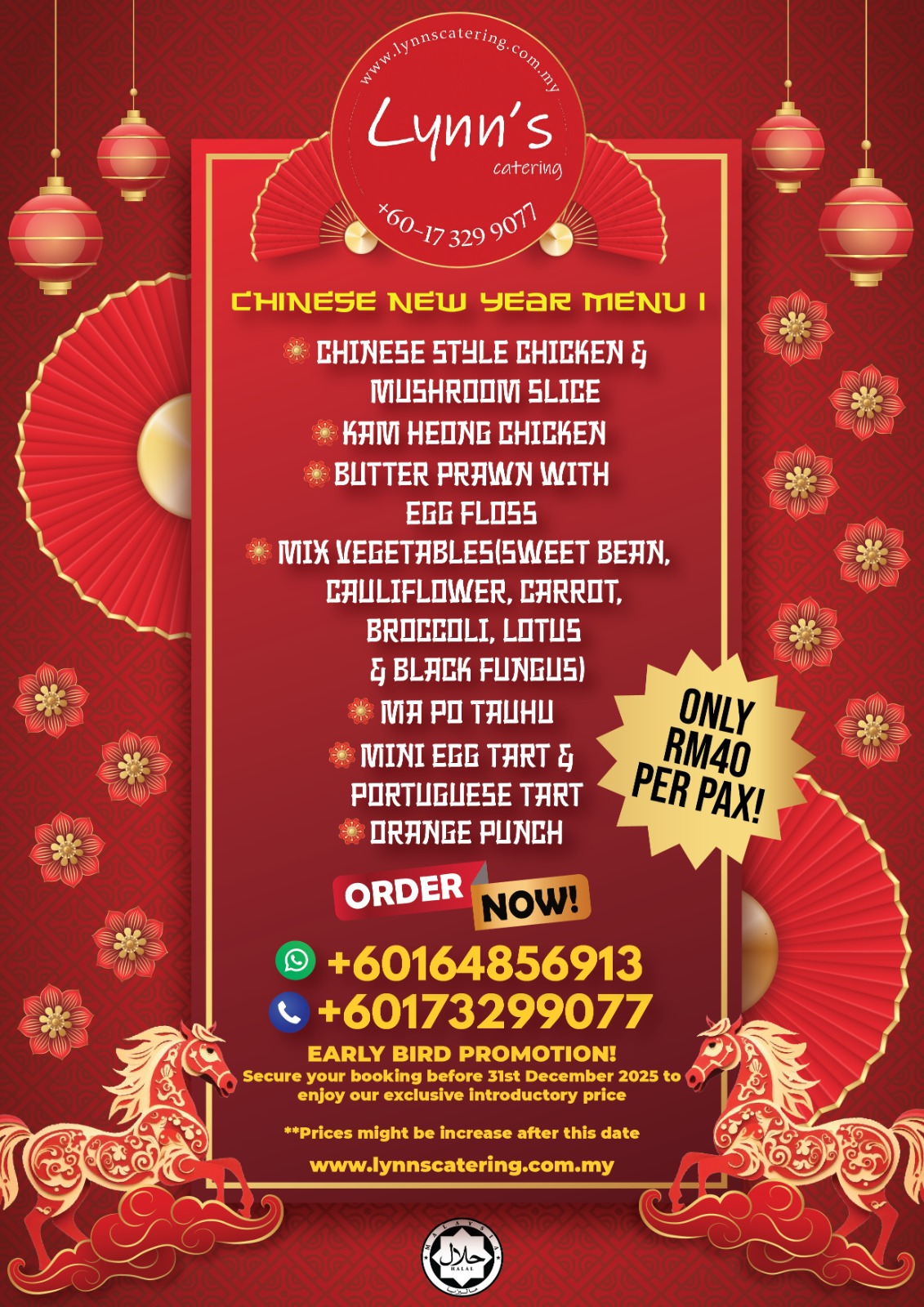 Money Bag & Spring Roll Eight Treasure Fried Rice Fry Bihun Rendang Chicken Broccoli, Cauliflower & Mushroom Kam Heong Fish Cantonese Japanese Tofu and Fucok Dry Butter Prawn Soyabean Jelly with Longan Fruit Platter Fruit Punch